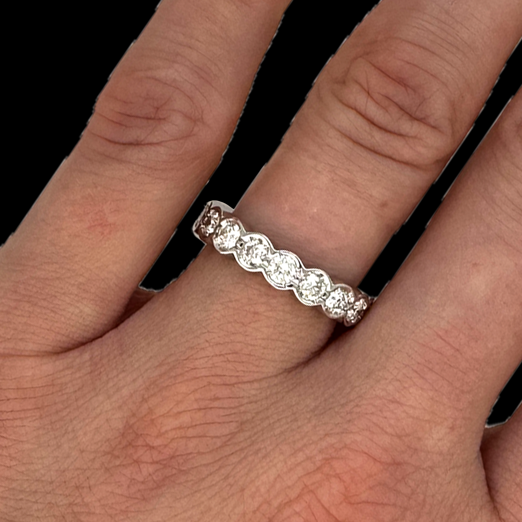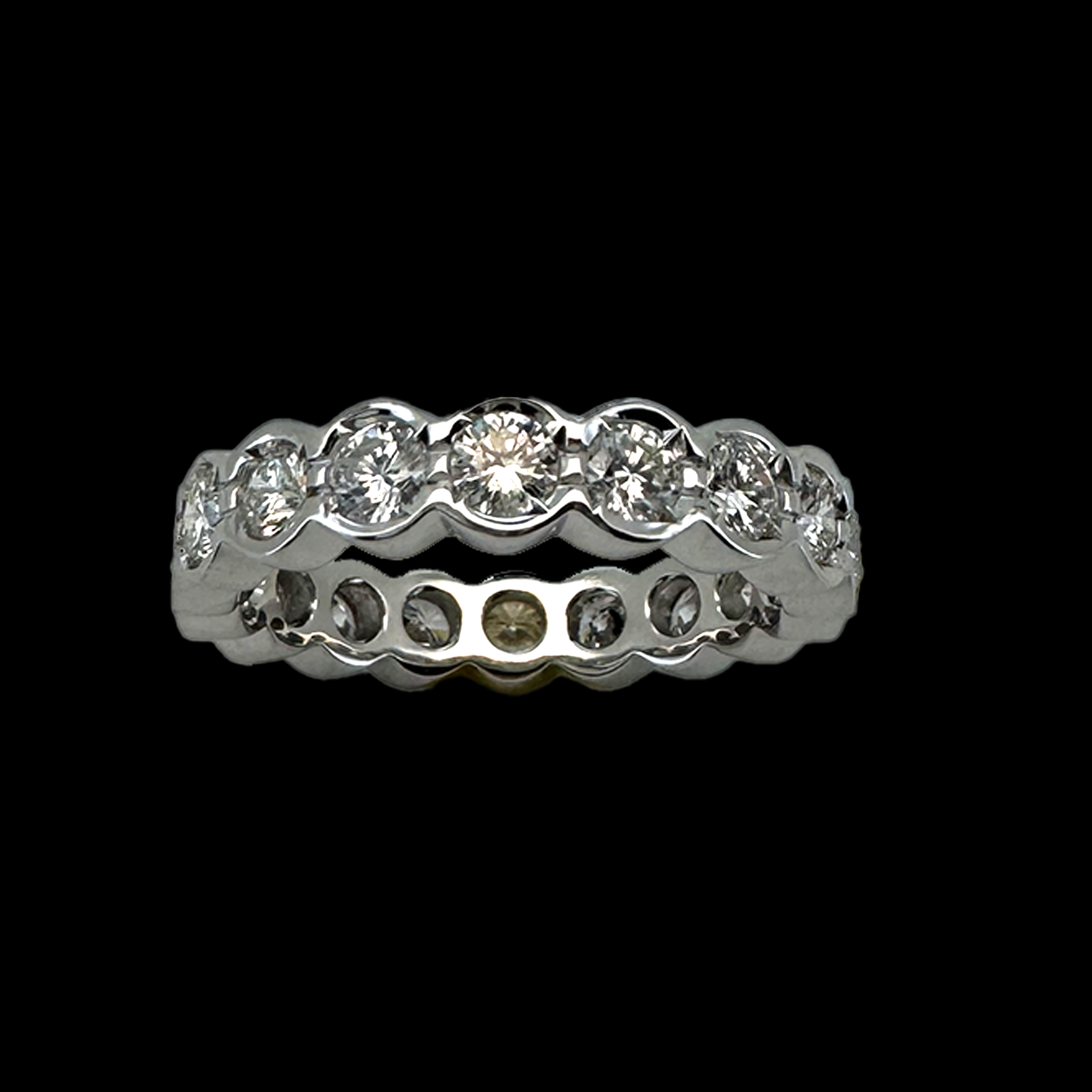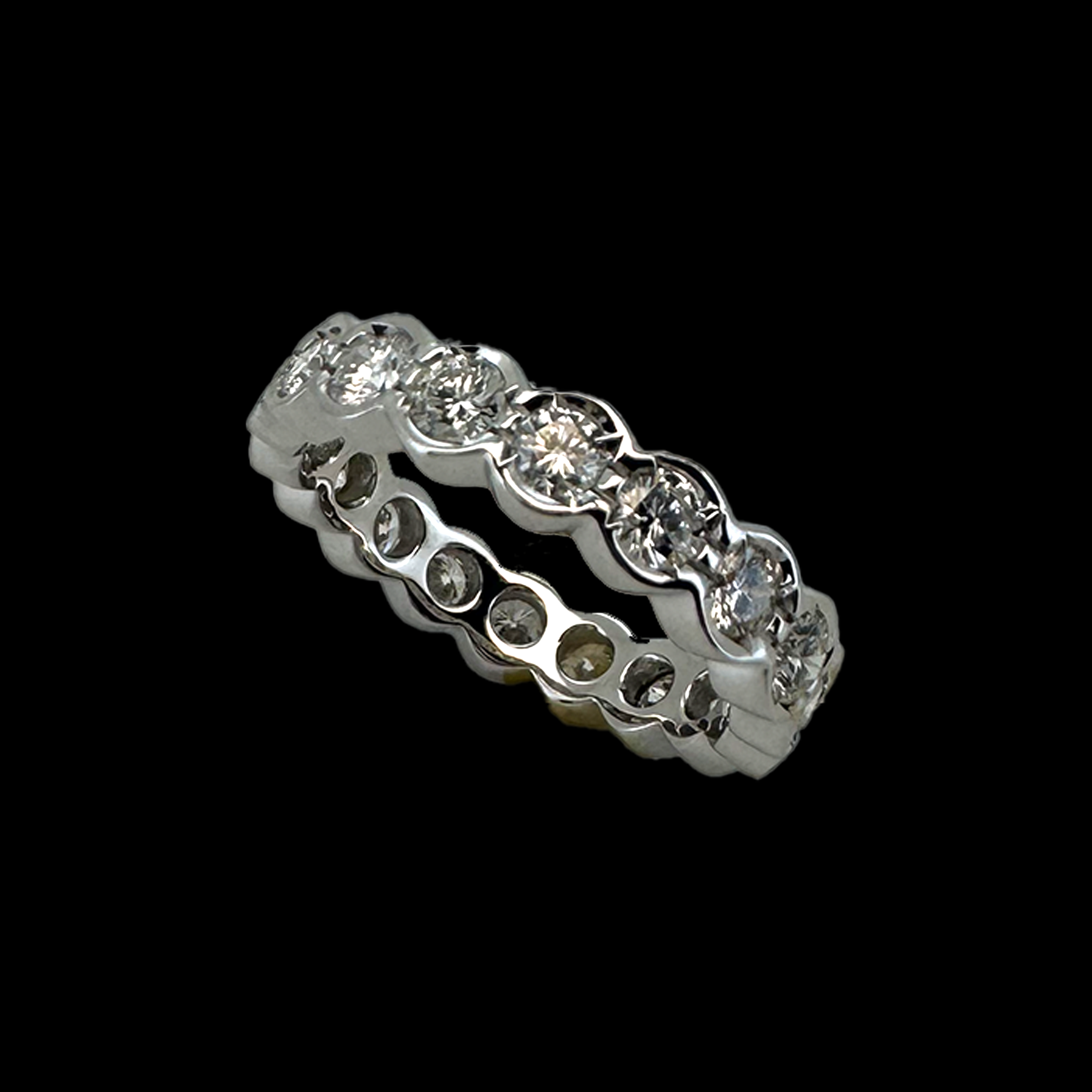 Bague Tour Complet en Or Gris sertie de 18 diamants blancs WI1 taille moderne, pour un total de 1,50ct. Mise à taille non possible.