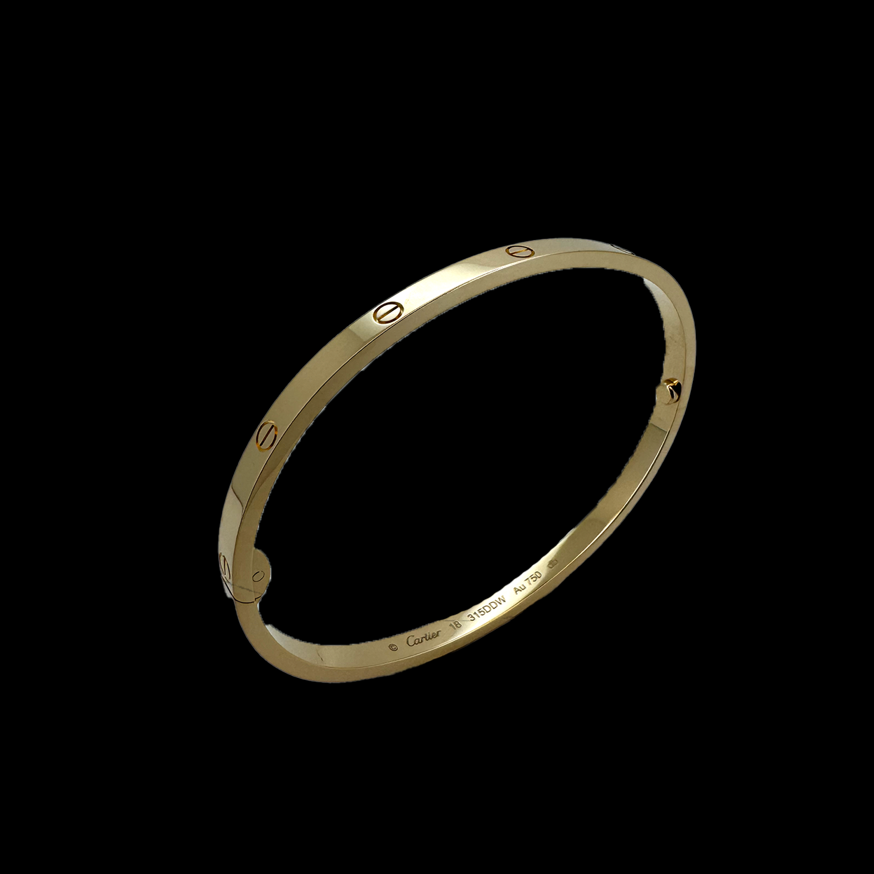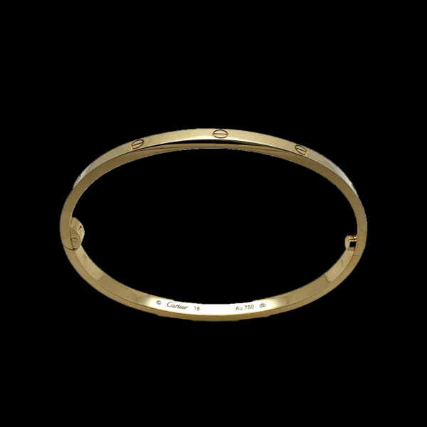 Bracelet Cartier Love Petit Modèle en Or Jaune 750. Taille 18 Largeur 3,65mm. Système de fermeture avec une vis fonctionnelle et une charnière.