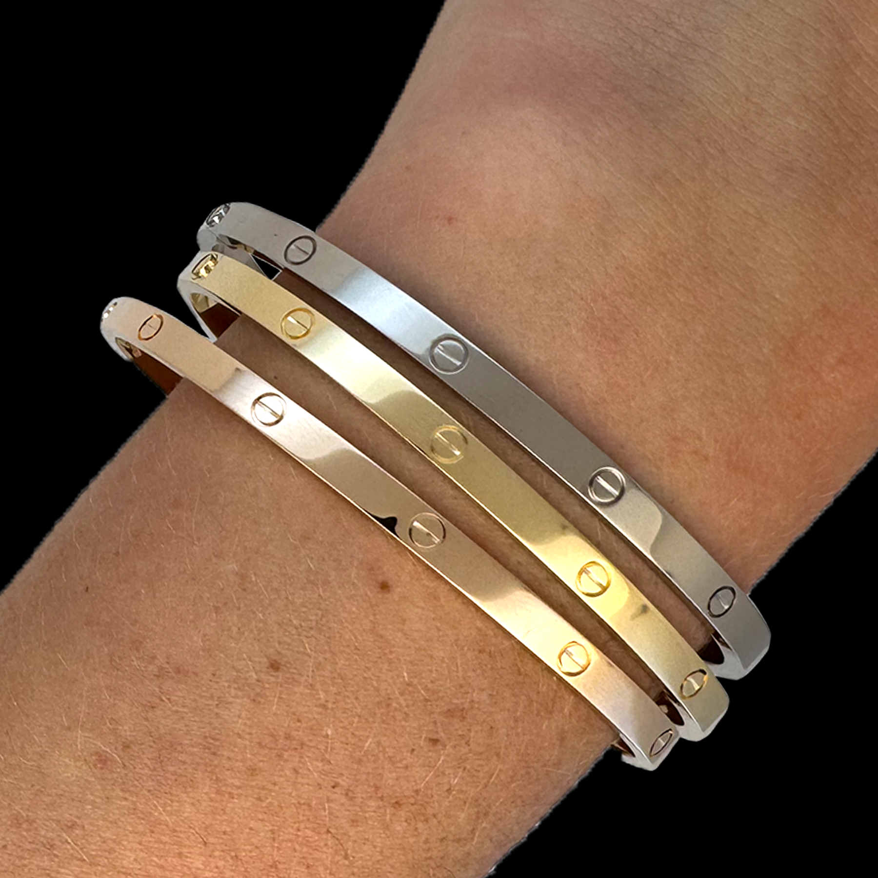 Description : Bracelet Cartier Love Petit Modèle en Or Jaune 750. Taille 18 Largeur 3,65mm. Système de fermeture avec une vis fonctionnelle et une charnière.