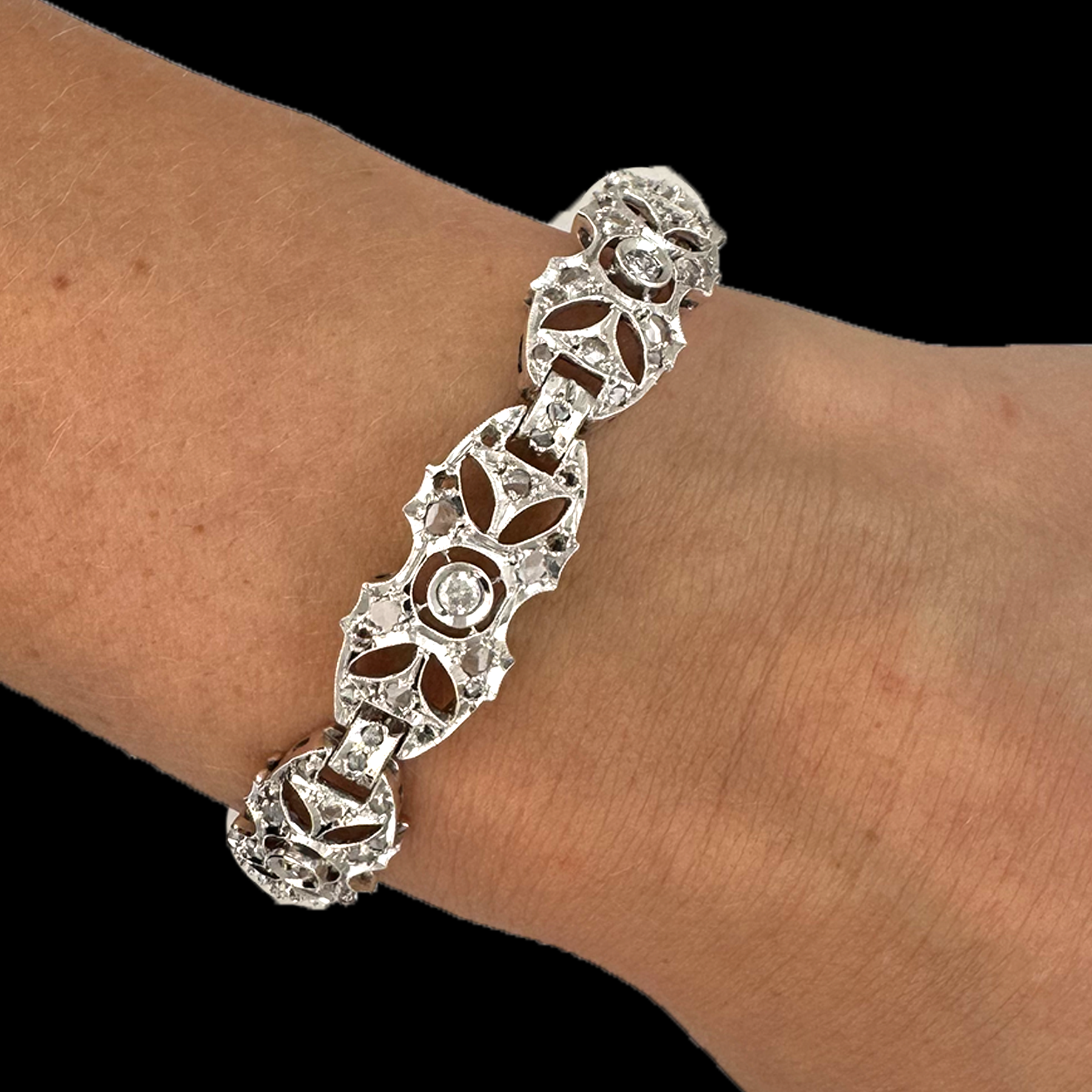 Bracelet Vintage en Or Gris 585, serti de Diamants taille ancienne avec un fermoir Cliquet pour une protection optimale.