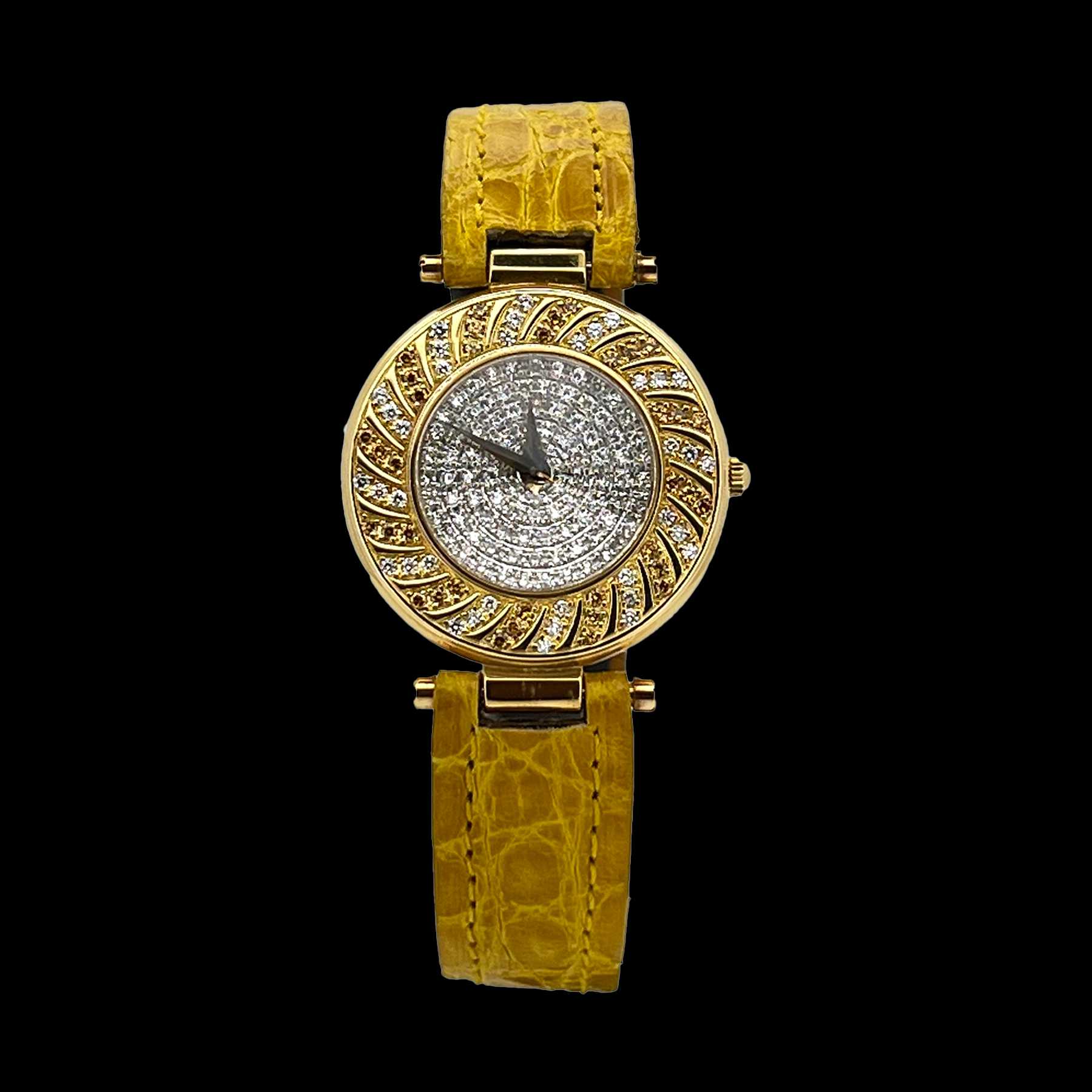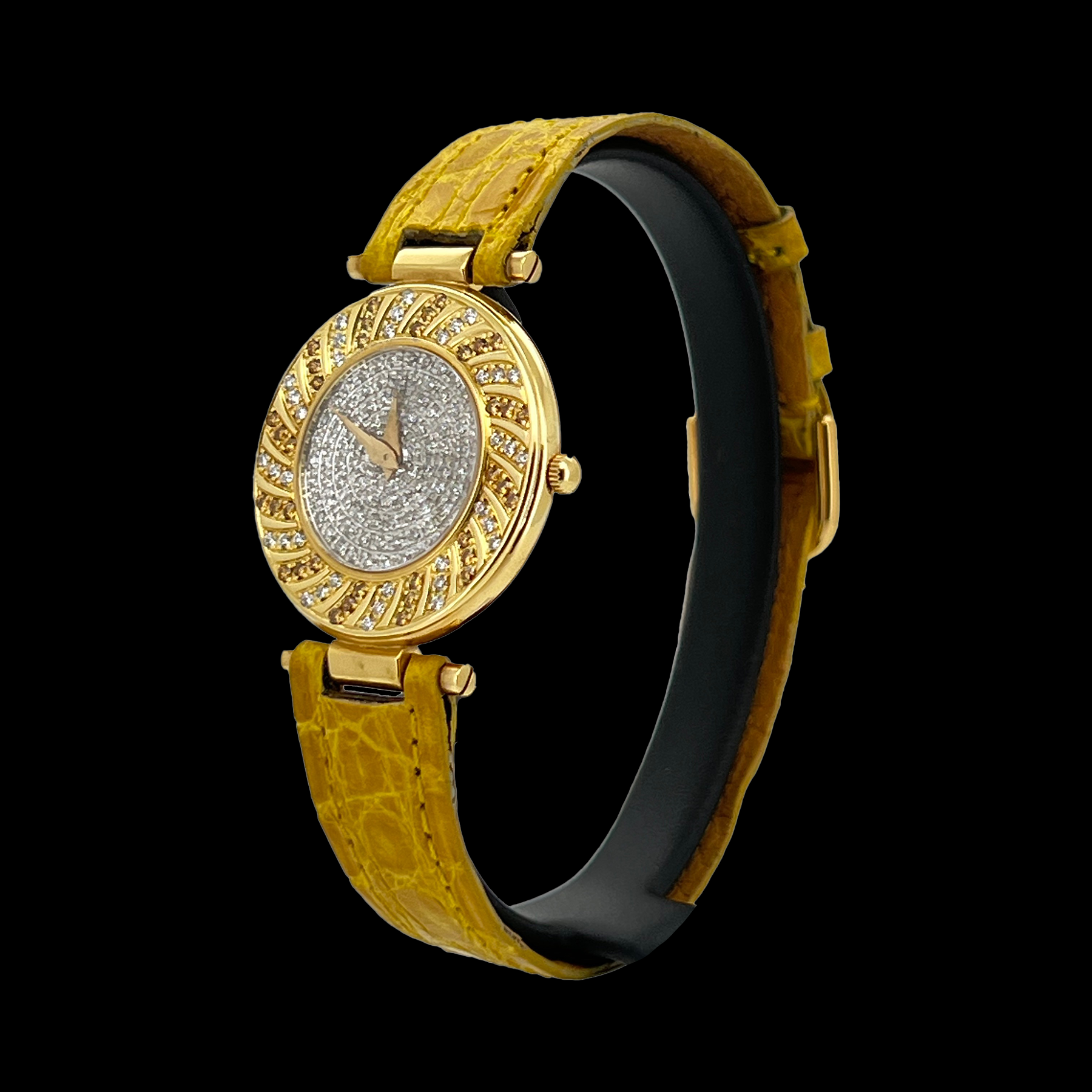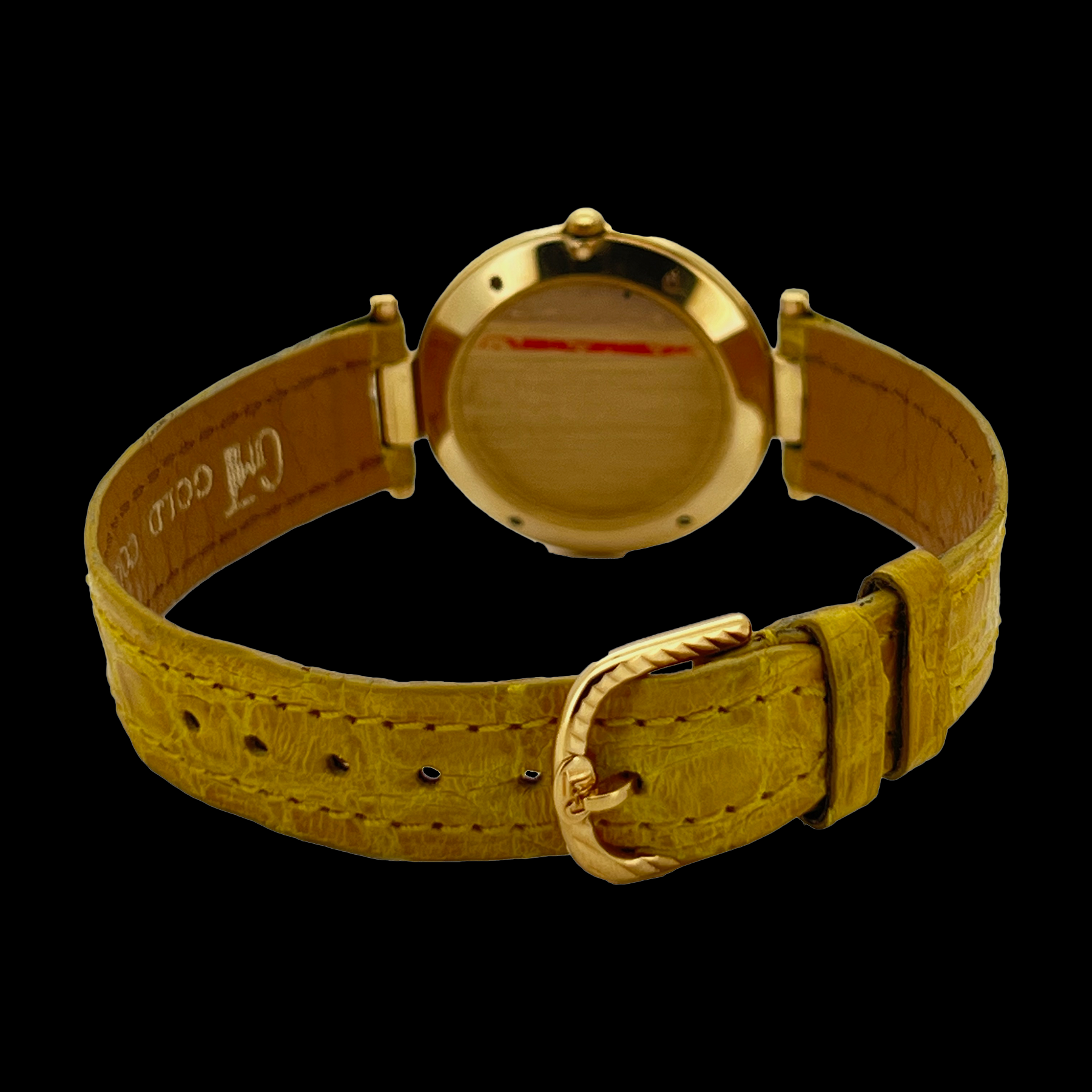 Montre GMT Gold Collection en Or jaune 750. Sertie de Diamants Blancs et Jaunes avec un bracelet en cuir d’Alligatore Jaune.
