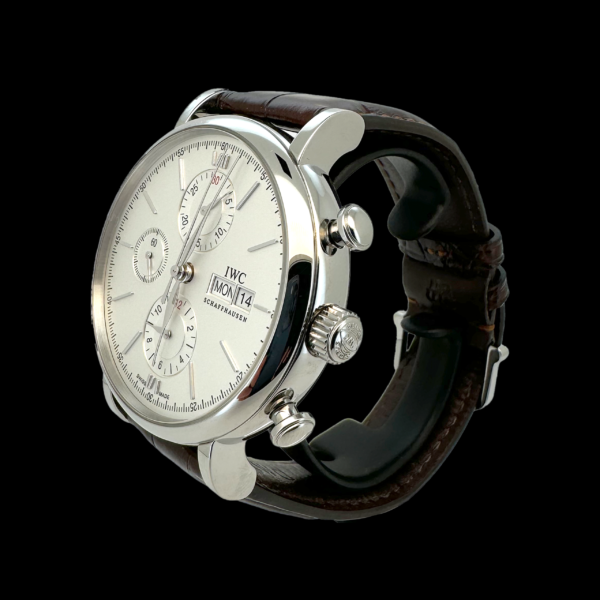 Description : Montre IWC Portofino Chronographe de 2022, en acier fin. Remontage automatique avec un bracelet brun foncé en alligator.