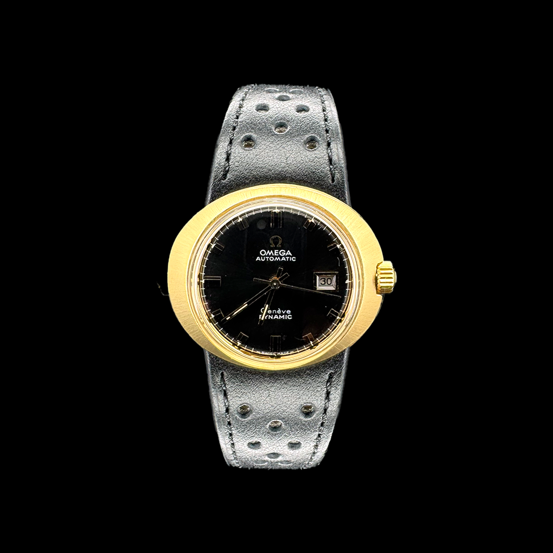 Description : Montre Omega Genève Dynamic Monocoque Ellipse Disco Volante. Modèle Vintage très rare, des années 70 en Or jaune 750 et bracelet Cosmic Cuir perforé Noir. Boucle ardillon en plaqué Or jaune 750. Service complet fait chez Omega en 2025 avec 2 ans de garantie.