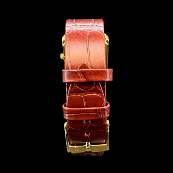Montre Piaget Protocol en Or jaune 750 de 1989. Munie d’un cadrant serti de Diamants et d’un bracelet cuir alligator écailles carrées marron “Mousse au Chocolat”. Le système de fixation du bracelet est rare et n’a été produit qu’à 500 exemplaires. La version sertie de Diamants est très recherchée.