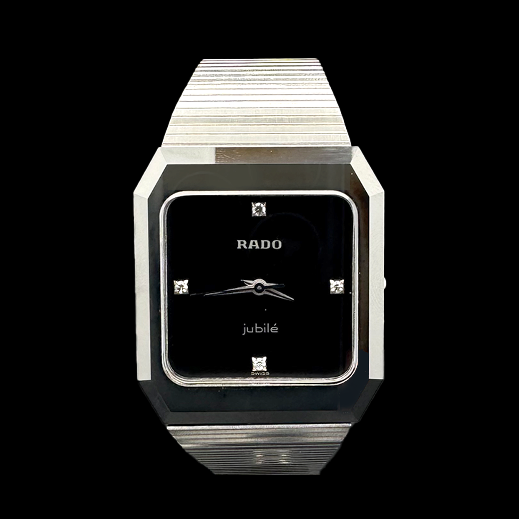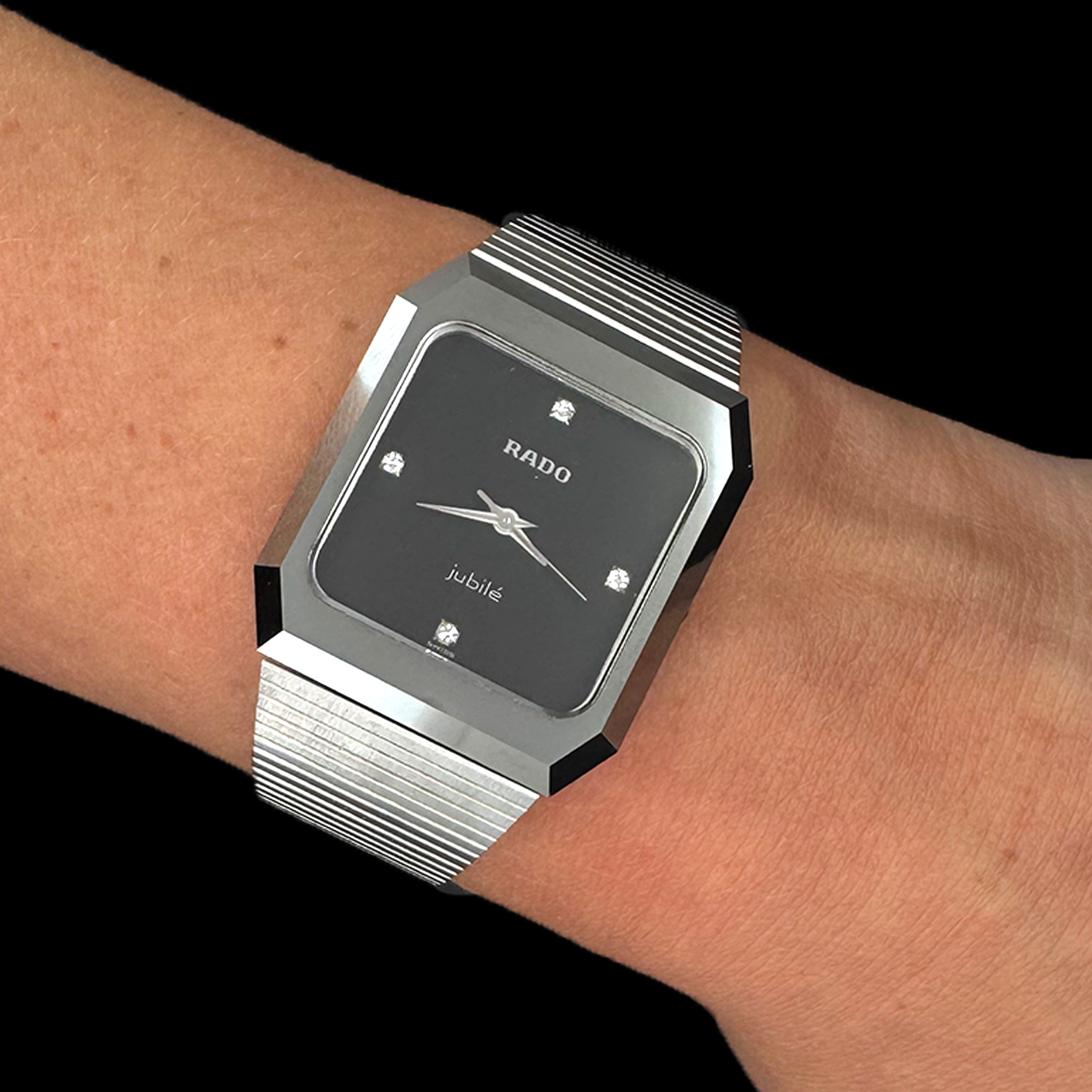 Description : Montre Rado Diastar Jubilé Special Edition. Montre en acier avec fermoir à coulisse en acier munie d’un cadran noir serti de 4 diamants. Montre en état neuf, avec service complet de 2026.