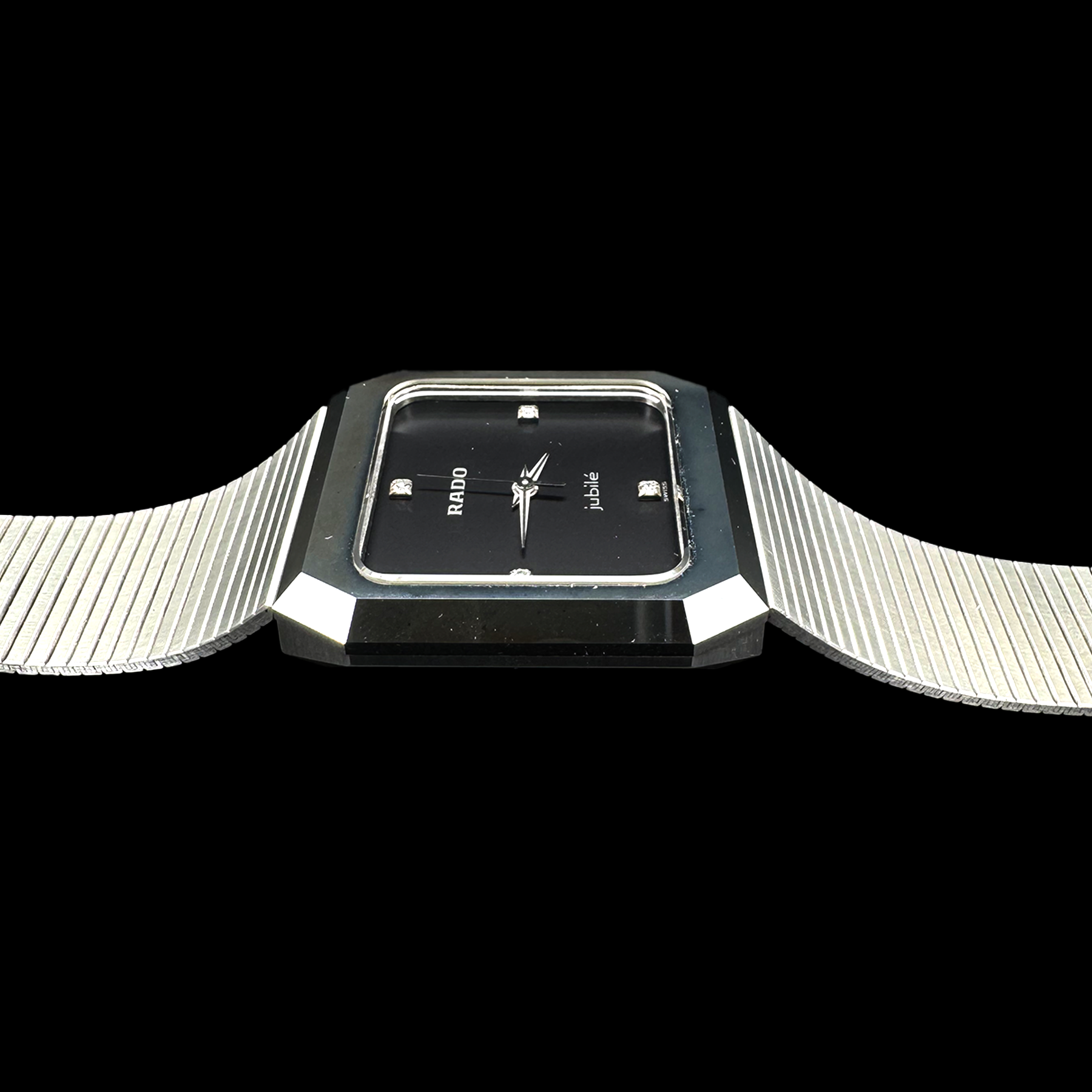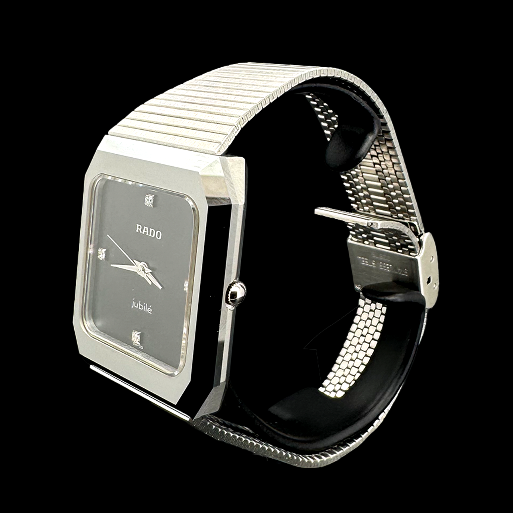Montre Rado Diastar Jubilé Special Edition. Montre en acier avec fermoir à coulisse en acier munie d’un cadran noir serti de 4 diamants. Montre en état neuf, avec service complet de 2026.