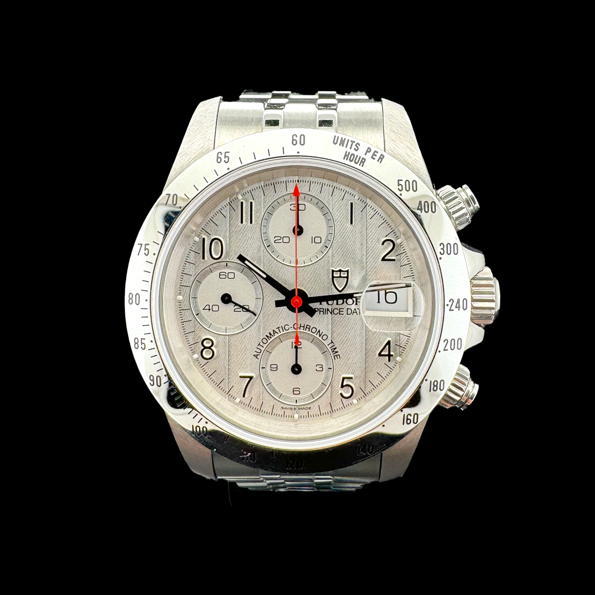 Tudor Prince Tiger Date Chronograph Automatique en Acier, munie d’un cadran de transition à gradins argentés et d’une lunette tachymétrique.